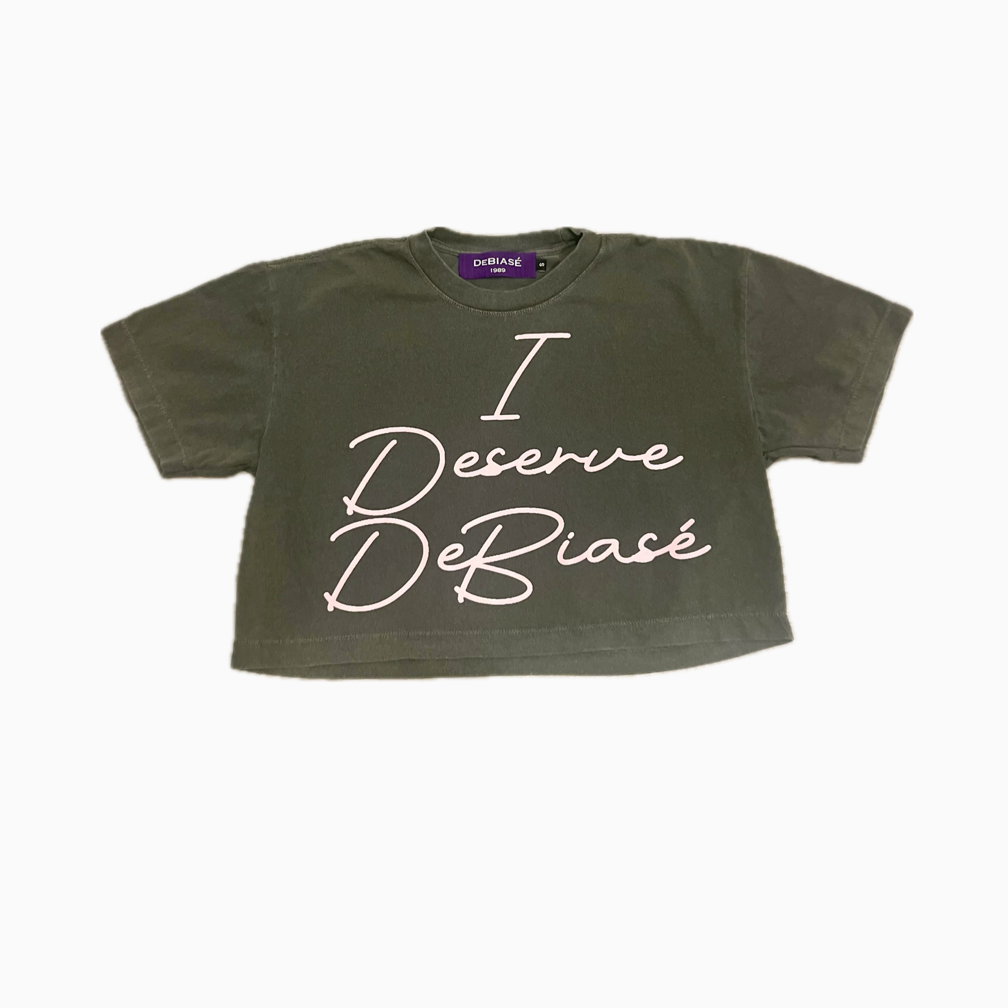 The “I Deserve DeBiasé” Crop Tee is where effortless luxury meets everyday attitude. Cut in a modern cropped silhouette, it drapes with intention—relaxed, yet undeniably refined. The washed olive tone feels lived-in and elevated at once, like your favorite vintage find reimagined for now.